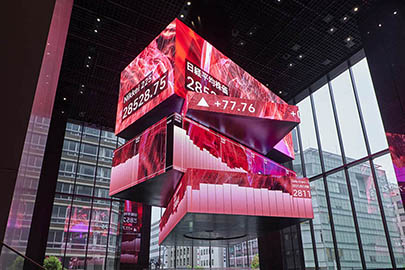 The HEARTは心臓をモチーフとした世界最大規模のキューブ型大型LEDディスプレイ(幅6m、高さ5.5m、奥行き3m)です。圧倒的スケール、さらにアイコニックなデザインかつマーケットの複雑な動静を表現する4面4分割回転式の構造体は、日本橋兜町の新たなシンボルとなります。